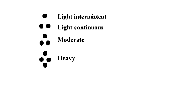 Precipitation intensities, as ascertained from measured precipitation rates or a reduction in visibility, are indicated on the chart by the repetition of symbols for rain, snow and drizzle. For example, the rain symbols can be used to represent the rain intensity: