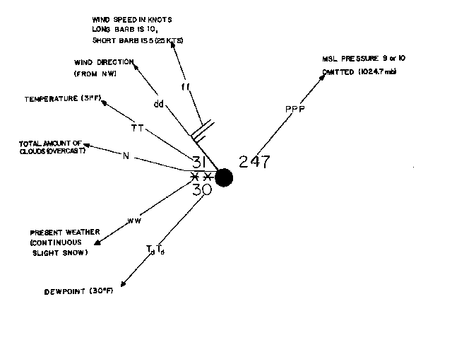 A display of all this information for many locations at one given time would be difficult to make and interpret unless a uniform system of plotting were adopted. The pictorial presentation and weather data together with an analysis can be determined at a glance. The location of each reporting station has been printed on the base maps as a small circle. The weather data from each reporting station are plotted around these circles on these base maps in a particular systematic fashion called a "station model". A sample station model for a weather observation station, complete with the proper position of the weather data: