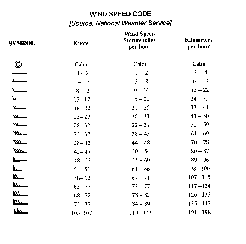 The number and length of the barbs on the tail of the arrow indicate the near-surface wind speed in knots (nautical miles per hour) using the following convention: